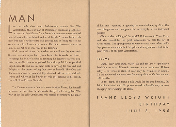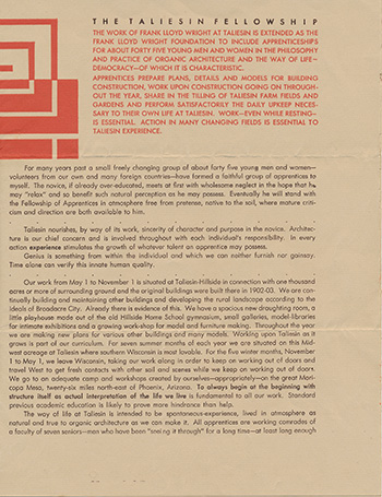 Description: A broadside describing Taliesin, the Taliesin Fellowship, the Taliesin Playhouse and its programs, an invitation to visitors to tour the buildings and attend the Playhouse programs, a list of Wrights books for sale, an illustration of Taliesin and a map of the Taliesin Complex. "Taliesin. Taliesin is the name because in Welsh tradition the word ‘Taliesin’ means ‘shining brow’ and was the name of the only British bard ever to sing the glories of fine arts: a Welsh name because of the Welsh ancestry of its master architect and owner – the founder and leader of the Taliesin Fellowship – Frank Lloyd Wright. The Taliesin Fellowship was established in the fall of 1932. It is not at all a school. Its work is culture, not education, and there is not curriculum..." Printed in two color on one side of a single sheet, folded twice into quarters. (Sweeney 2039)