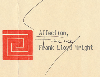 Unfolded full size page 2. Emboss has been enhanced. Detail of Frank Lloyd Wright facsimile signature.