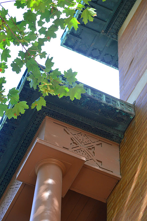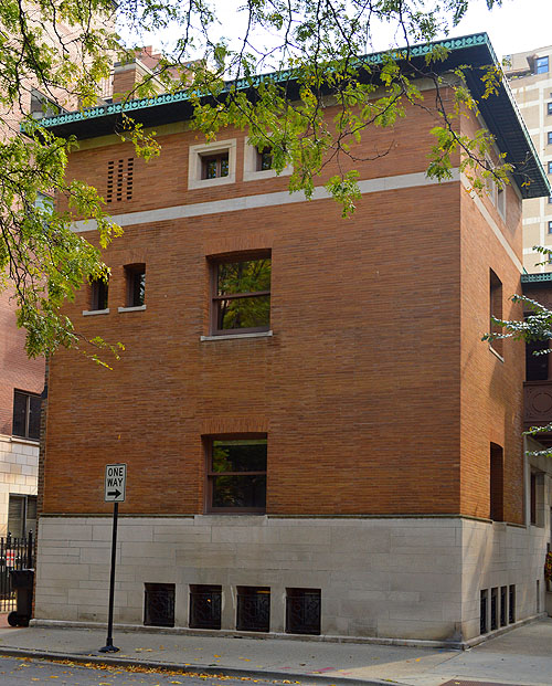 The house at No. 99 Astor Street (Charnley) is one of the few which came from the office of Adler & Sullivan. Severe in its general aspect, its richness of detail is massed at and above the entrance and in the cornice. In these parts wood and copper have been employed, contrasting darkly with the buff Roman brickwork. Unfortunately the effect of this little building is now seriously marred by the huge walls of a newly built apartment house near by.(Digital edition.) (Sweeney 54)