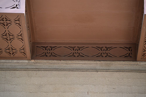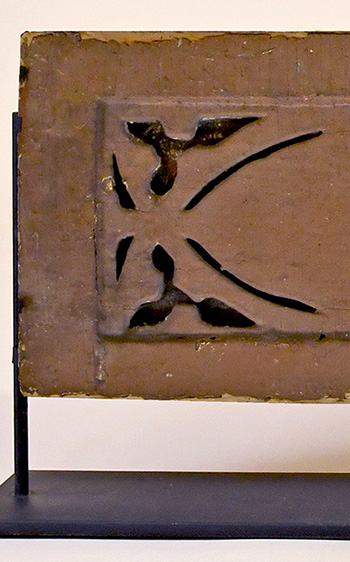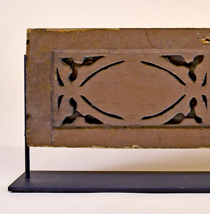 This panel was originally located beneath the inset balcony on the second level of the front facade. There are eight columns supporting the roof of the projecting portion of the balcony. Beneath each column under the balcony are eight decorative “supports”. This piece is one of eight end caps. This design appears on the ends and three sides as-well-as the back space between the supports. A similar design is on the front facade of the balcony and is repeated seven times. In 1986 the Charnley Residence was purchased by the architectural firm of Skidmore, Owings and Merrill and subsequently went through an extensive renovation. This piece was removed during the renovation.