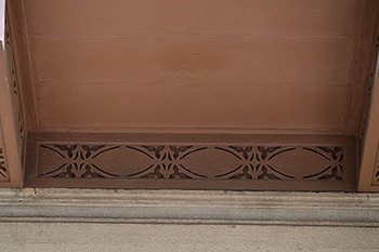 This panel was originally located beneath the inset balcony on the second level of the front facade, just above the front entrance. There are eight columns supporting the roof of the projecting portion of the balcony. Beneath each column under the balcony are eight decorative “supports”. Between each support, directly above the entrance are seven fascia. This piece is one of the seven fascia pieces. This design appears on the ends and three sides as-well-as the back space between the supports. A similar design is on the front facade of the balcony and is repeated seven times. In 1986 the Charnley Residence was purchased by the architectural firm of Skidmore, Owings and Merrill and subsequently went through an extensive renovation. This piece was removed during the renovation.