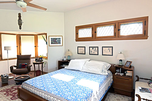 Description: View of one of the four bay windows with built-in seating. Designed by Frank Lloyd Wright in 1890. Label pasted to verso: "Frank Lloyd Wright House. Edsel and Mary Ruddiman, stand on the front porch of their Ocean Springs home designed by Frank Lloyd Wright. The rounded corners of the house were part of Wright's design. The Ocean Springs waterfront home was designed by Frank Lloyd Wright in the 1930's (sic). Photographer Kathy Anderson. Date 2/20/95." Photographed by Kathy Anderson.