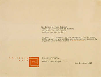 Their relationship was quite tumultuous. Wright explains in his Autobiography that he married her to rescue their relationship. "Marriage resulted in ruin for both. Instead of improving with marriage, as I had hoped, our relationship became worse." (An Autobiography, p 260). They quarreled a great deal, she was addicted to morphine, and in less than a year they were separated. In 1924, after the separation, but while still married, Wright met Olgivanna at the Petrograd Ballet in Chicago. On November 27, 1925 Miriam filed for a divorce, alleging desertion and cruelty. After a three year legal battle, they were divorced on August 26, 1927. Olga and Frank were married on August 25, 1928 at midnight in Rancho Santa Fe near La Jolla. The ceremony was held one year to the day after Wright's divorce from Miriam... Continue...Text of letter: