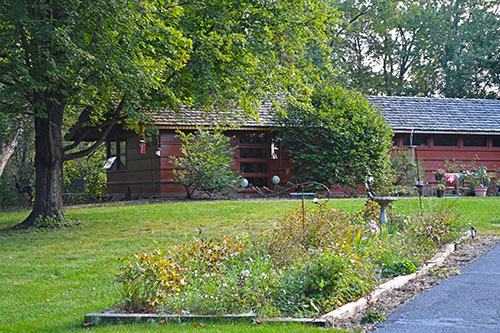 On a trip through Wisconsin we made a quick stop at the Iber Residence. The tall gated fence makes it clear that visitors are not welcome. The floor plan is similar to the other Prefab #1 homes although this home has four bedrooms. It is constructed of limestone. The board and batten siding is painted.