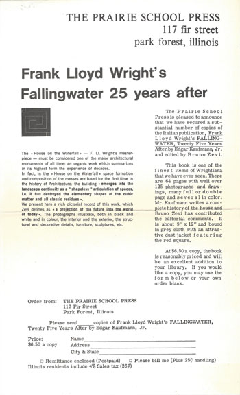 Date: 1965 Title: "Frank Lloyd Wrights Fallingwater 25 years after." (Broadside published by Prairie School Press, Chicago)