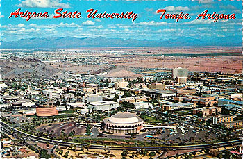 Description: Front: "Arizona State University, Tempe, Arizona". Back: "Arizona State University, Tempe, Arizona. Aerial view of Tempe and the Arizona State University Campus. The beautiful Grady Gammage Memorial Auditorium, designed by Frank Lloyd Wright, is in the center of the view. To the right of "A" Mountain in the background is the Sundevil Stadium packed with football fans, watching the post season ‘Fiesta Bowl’ game. Aerial photo by Bob Petley." Published by Petley Studios, 4051 E. Van Buren, Phoenix, Arizona. #P301519. Plastichrome(R) (Constructed between 1962-1964, and opened in 1964 the building is named for Dr. Grady Gammage.) (The Fiesta Bowl was first played at the Sundevil Stadium in 1971 and continued there until 2006. ASU played in five of the first seven Fiesta Bowls. The round ASU Music Building (to the left of the Auditorium) was designed by the Frank Lloyd Wright Foundation and completed in 1971.)