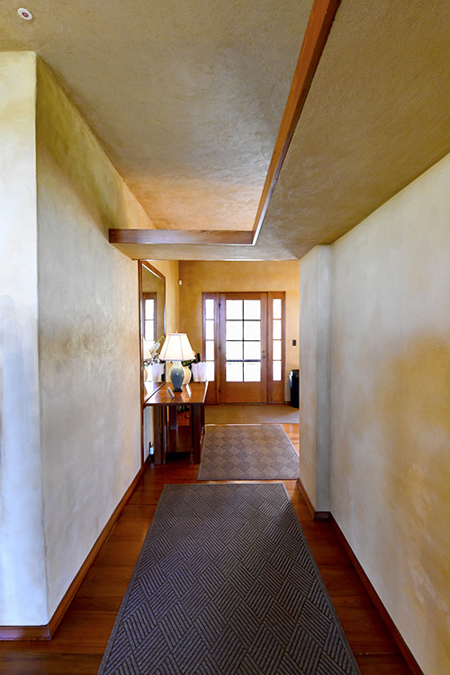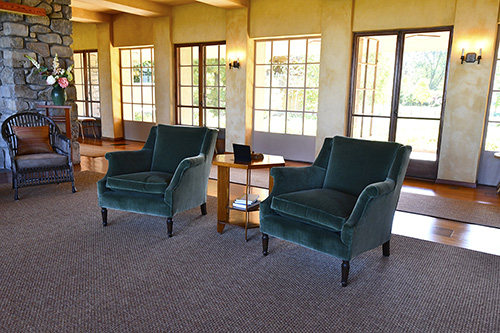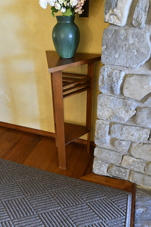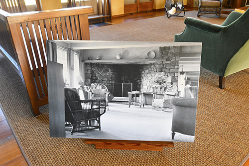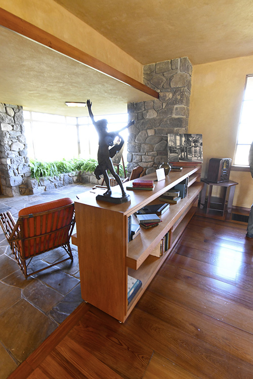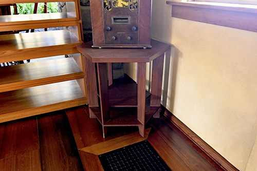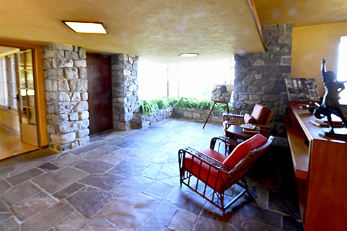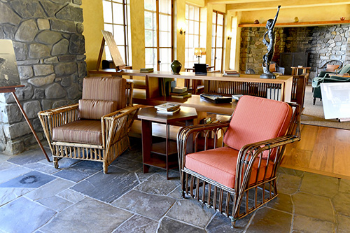 room with stick-and-reed armchairs, a Wright designed hexagon