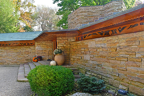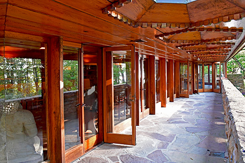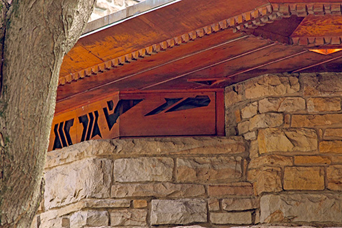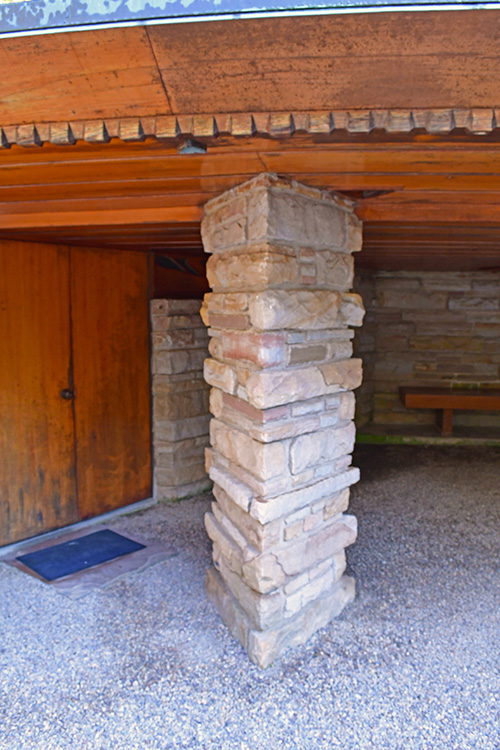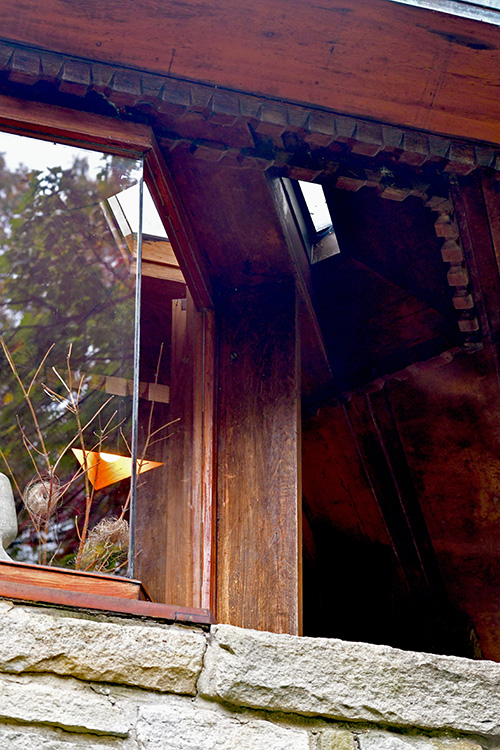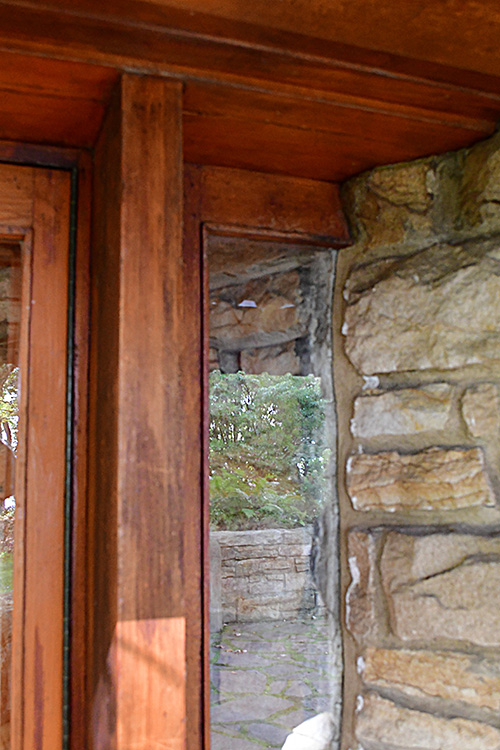 The floor is paved with flagstone, the walls are crafted from sandstone in the style of Wright's Taliesin. The woodwork throughout the space showcases exceptionally fine craftsmanship, particularly evident in the trellis that runs alongside the living room and dining area. The interior partitions are constructed using a board and batten technique. The roof features a hip design sheathed in copper.