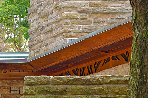 Description: View of the roof overhand cantilevered off the end of the Living Room. Designed by Frank Lloyd Wright in 1954. Text on sleeve: "Wright, F. L. - Hagan House, 4-13. I. N. Hagan House. (d) roof overhang openings, living rm wing. Chalkhill, PA, USA, 1954. Wright, Frank Lloyd: architect." Acquired from the archives of the University of Virginia.