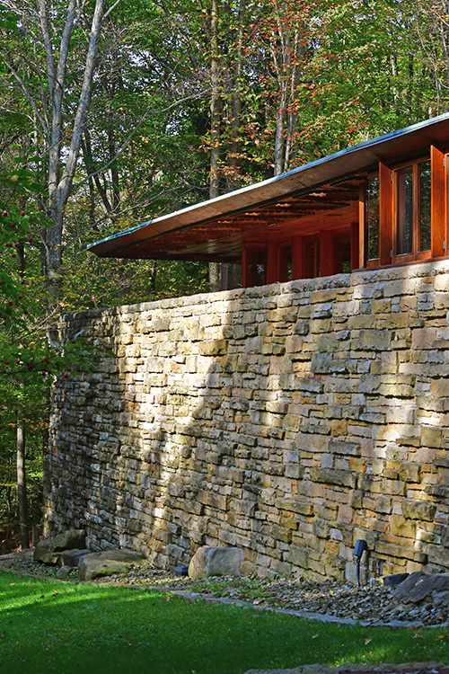 But the Hagan house, on its hill crown overlooking hundreds of acres of beautiful Pennsylvania forests - not far from Fallingwater - grew to be an especially elegant work, most particularly in its fine stone masonry and beautiful carpentry. The plan wraps around a gravel entry court, with carport at one end, entrance in the center, living room at the other end. The tall masonry-enclosed workspace is part, as usual, of the livingroom fireplace mass. Both dining and living rooms give onto a stone terrace that commands the view of the surrounding land-scape. The working drawing elevations clearly reveal the great amount of stonework employed in this dwelling, with a gentle hipped roof that lends a sense of serene shelter above the drama of the stone masonry.” Frank Lloyd Wright Monograph 1951-1959, Pfeiffer, 1988.