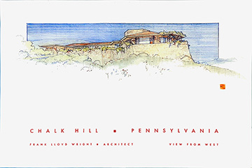 Lower text: "Chalk Hill, Pennsylvania. Frank Lloyd Wright, Architect. View From West." Text in red square: "FLLW, Feb 1 54."