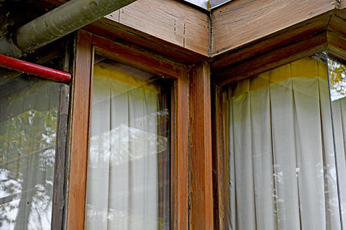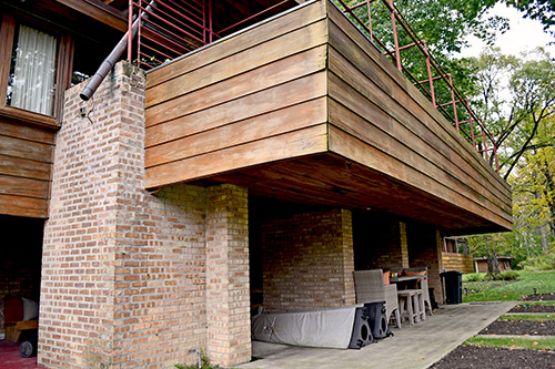 Description: Exterior view of the Lloyd Lewis Residence. Designed in 1939, the upper screened terrace cantilevers out over the Loggia below. Photographed by Wayne Andrews, published in "Architecture, Ambition and Americans" p.241, which was first published in 1947. Label pasted to face: "University of California, Berkeley. 20th Century - United States. Wright, Frank Lloyd. Lloyd Lewis Residence. Libertyville, Illinois. 1940. Close-up. Andrews 389. Department of Architecture." Acquired from the archives of the University of California, Berkeley.