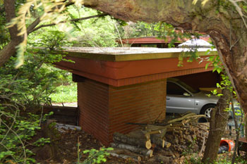 Description: 22) A brick triangle pier anchors the back of the carport, The front side of the carport roof is cantilevered. Set of 24 photographs of the exterior of the Rubin Residence in Canton, Ohio. Copyright 2015, Douglas M. Steiner.