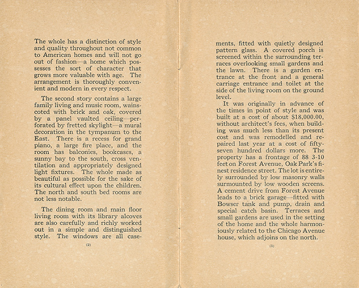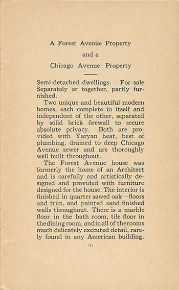 The Forest Avenue house was formerly the home of an Architect and is carefully and artistically designed and provided with furniture designed for the house. The interior is finished in quarter sawed oak-floors and trim, and painted sand finished walls throughout. There is a marble floor in the bath room, tile floor in the dining room, and in all of the rooms much delicately executed detail, rarely found in any American building...