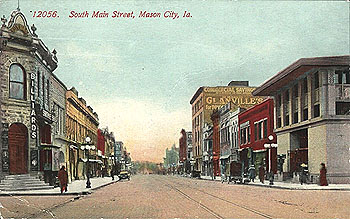 Description: "12056. South Main Street, Mason City, Ia." City National Bank is on the far right. Frank Lloyd Wright was commissioned by attorneys, James E.E. Markley and James E. Blythe to design a building for their bank. Markley made Wright's acquaintance while visiting his daughter during her stay at the Hillside Home School, in Spring Green, Wisconsin. Wright was commissioned to design both the City National Bank and Park Inn Hotel in early 1909 and construction began April 1, 1909. Construction was completed in August 1910. Verso: "Pub. By The Acmegraph Co., Chicago." Divided back. This side for the Address." Postmarked "Sep 2 - 13."