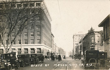 Description: View of Main Street looking South. City National Bank is on the far right. A barber shop pole is outside the front left corner of the bank. Both automobiles and horse drawn buggies are using the street. Street car tracks are embedded in the street. Electric wires overhead would indicate electric street cars. Lettering at the top of the building on the left reads “City Bank.” Possibly the building the City National Bank used before the building designed by Frank Lloyd Wright in 1909. Text on face: “Main St. South From State. Mason City, Iowa. - 6167.“ Frank Lloyd Wright was commissioned by attorneys, James E.E. Markley and James E. Blythe to design a building for their bank. Markley made Wright's acquaintance while visiting his daughter during her stay at the Hillside Home School, in Spring Green, Wisconsin. Wright was commissioned to design both the City National Bank and Park Inn Hotel in early 1909 and construction began April 1, 1909. Construction was completed in August 1910. Verso: “Post Card.” Text in the top right corner: “Genuine Photograph.” Vertical text on left side: “L. L. Cook Company, Lake Mills, Wis. 8-4.” Center vertical text dividing two sides: “Sterling Quality.” Real photo postcard.