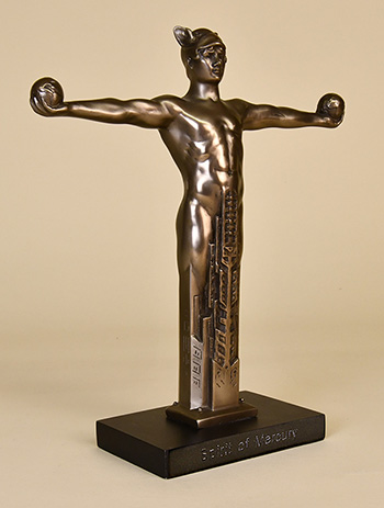 Text on base: “Spirit of Mercury.” 11" High x 10.5" Wide x 2" Deep. Base: 5.625 Wide x 3.75" Deep x .75" High.