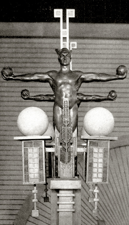 Mercury, the god of Greek mythology was a son of Zeusand fostered abundance and prosperity, and consequently was adopted as the patron of commerce and finance. He has always been depicted as a slim youth of nervous disposition and fleet of foot, serving as messenger to the gods. His field of action was varied and manifold and not always creditable to himself. In applying the spirit of Mercury to our modern purposes (symbol-ically speaking) he serves the purpose of the general development of the money power, and like it springs from the soil to organic shape to become that tremendous factor, the all powerful domineering spirit of the time, to whom kingdoms bow and nations tremble. The figure therefore is depicted as rising straight like a plant out of the ground assuming shape as it develops and crystallizes, this being emphasized by the chrystal forms clinging to the figure much in the nature of a chrysalis. The upper part of the figure shows it to be of unusual strength upon whose powerful straight arms, lever-like, the world is balanced. The head-dress of wings and dolphin head are characteristic of Mercury as represented by the ancients.
