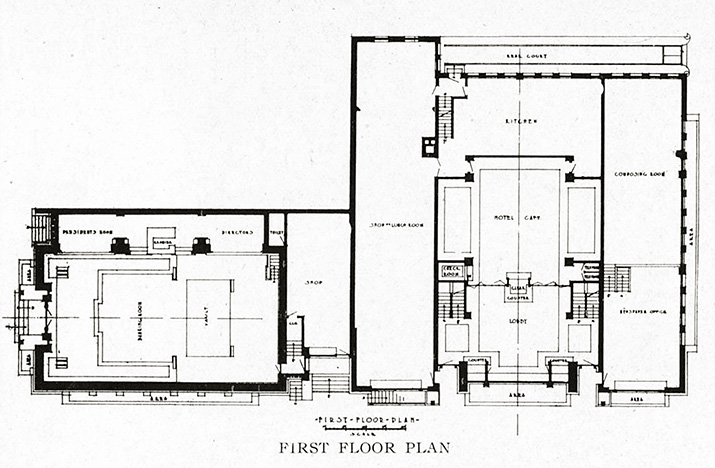 Title: 2) City National Bank and Park Inn Hotel, Mason City, Iowa, Hotel Ground Floor Plan 1910 (1909 - S.155-156).