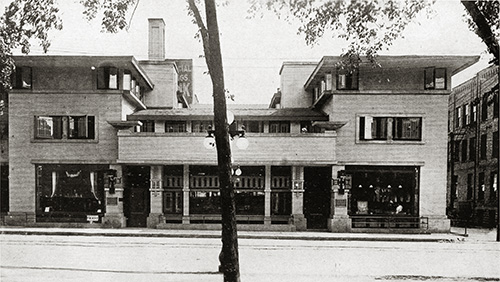 In 1907, when the two law partners were looking for an architect to compete in quality with the eight-story bank building that would be built across the corner by a competing bank, they didn't hesitate to give the commission to Frank Lloyd Wright, the young architect who was building a reputation in the Chicago area. For them he would build a complex, multi-purpose building that would give them multiple income streams. Their office would be on the second floor of its central waist surrounded on the east by a two-story banking room with rental office space above and a 42-room hotel on the west with basement shops beneath the two major building segments. He managed to pack all these functions into an aesthetically well-integrated building that architecturally would be the bridge between the Prairie School and Midway Gardens and the Tokyo Imperial Hotel to follow.