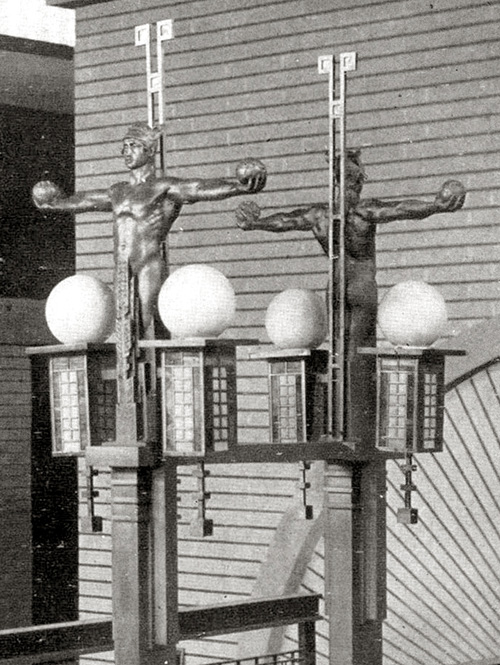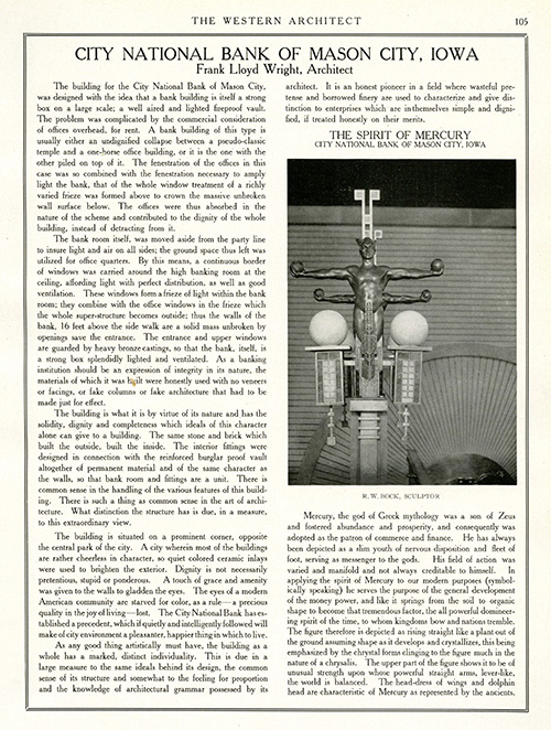 Description: Frank Lloyd Wright's design for the bank featured four "Spirit of Mercury" statues positioned over the teller cages. Sculpted by Richard Bock, these figures were ingeniously incorporated into light fixtures. The statues were illuminated by the reflection of light off art glass bands embedded in the brickwork. When the building was remodeled in 1926, the four statues were removed. One statue went to the library. Another to a Wright-designed Trier Residence (1956 - S.398) in Johnston, Iowa.