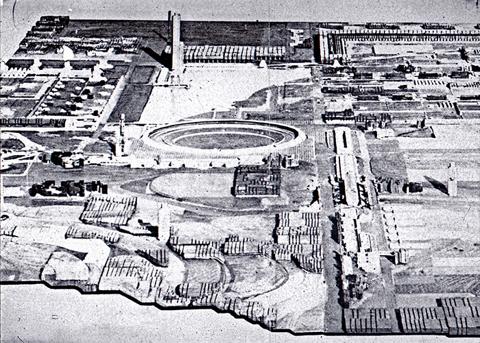 Description: Detail of the Broadacre City Stadium within the 12 foot by 12 foot model of Broadacre City. Broadacre was shown publically for the first time April 15 to May 15, 1935 at the Industrial Arts Exposition in Rockefeller Center, New York. Published in Frank Lloyd Wright, The Living City, Wright, 1958, p.103.