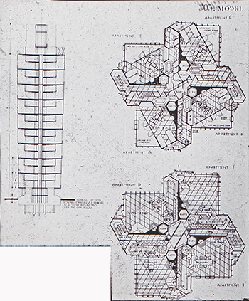 Description: Side view and floor plan. Frank Lloyd Wright was commissioned in 1929 to design an apartment complex by his long term friend William Norman Guthrie, pastor of St. Mark's in the Bouwerie. This was Wright's first use of his Taproot foundation design. It became the Broadacre model and later resurrected for the Price Tower.