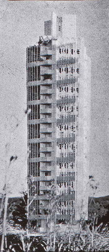 Description: Perspective for apartment complex, designed in 1929 by Frank Lloyd Wright for his long time friend William Norman Guthrie, pastor of St. Mark's in the Bouwerie, New York. This was Wright's first use of his Taproot foundation design. A second tower in the complex can be seen to the right. It became the Broadacre model and later resurrected for the Price Tower. Illustration published in The New York Times Magazine, March 20, 1932, p.9.