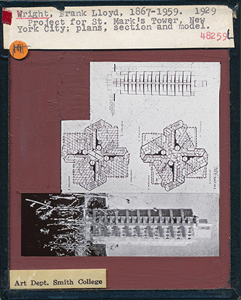 Description: Frank Lloyd Wright was commissioned in 1929 to design an apartment complex by his long time friend William Norman Guthrie, pastor of St. Mark’s in the Bouwerie. This was Wright’s first use of his Taproot foundation design. It became the Broadacre model and later resurrected for the Price Tower. Includes an illustration of a section and two floor plans, and a photograph of the model. Label affixed to face: “Wright, Frank Lloyd, 1867-1959. 1929. Project for St. Marks Tower. New York City; Plans, section and model. 48259L." Second small label: “Art. Dept. Smith College.” Acquired from the Art Department at Smith College.