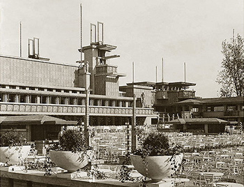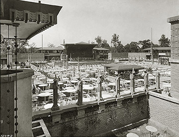 In idea, the Midway Gardens are modeled after the gardens of Germany and other Continental European countries. Instead of the stiff rows of benches which have characterized other American parks of similar intent , the interior court is dotted with small white tables and chairs at which the audience may supplement its appreciation of music with a cooling glass or a comforting supper.