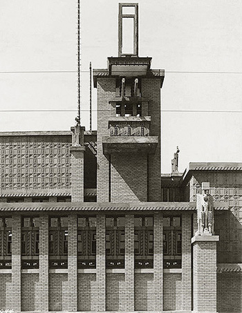 The main body of the pavilion occupies the central two-thirds of the east side of the gardens. At either side, massive brick pedestals rise to the level of a low overhanging balcony, the wall of which is constructed of ornate filagreed panels of concrete, capped by a concreted coping. Above the level of this balcony, the pedestals are continued in rectangular ornamented panels of concrete. At either end of the balcony stands a winged figure holding a cube aloft, all cast in concrete. Behind and inside these pedestals, others of the same concrete panels rise and between these runs a high wall of the panels.