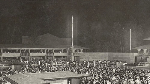 The gardens are about square in shape. At the east is the main pavilion, several stories in height "” though the stories are really low-ceiled balconies ranged around a main central room. In the front of the building, on either side, are two smaller rooms, with leaded glass windows and mission woodwork, to be used as grill rooms. In the basement are the kitchens, ice-boxes, serving counters, etc. Inclined ways lead up and out from this level to that of the central court on either side. The switchboards for the lighting system, lavatories, etc., are also located in the basement.