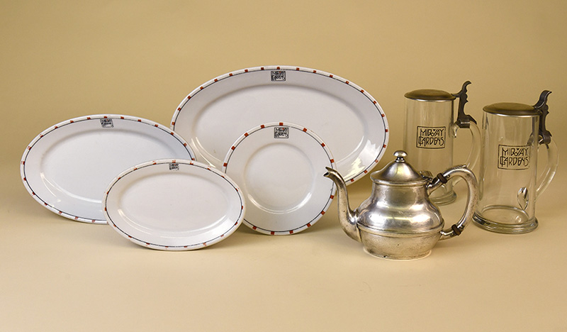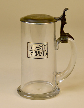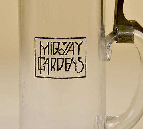 The Frank Lloyd Wright Archives at the Avery Library, Columbia University hold 174 original drawings for Midway Gardens. There are six that illustrate table settings: 1) 1401.06: Chairs, Table, Lamp, Tableware. 2) 1401.17: Table, Chair, Linen, Parasol. 3 & 4) 1401.18 & 20: Wood Chair, Table, Lamp, China. 5) 1401.83: Chinaware Studies. 6) 1401.179: Table, Chair. There are no specific designs for beer mugs, unlike designs for china. But there are two drawings with beer mugs, slightly different in design. We surmise that these mugs may have been ordered out of a catalog and imprinted with the monogram Frank Lloyd Wright designed.