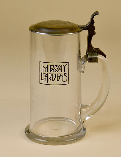 Description: Two original beer steins from the Midway Gardens, 1914. Midway Gardens covered a city block and included the exterior summer garden with performance stage and an interior Winter Garden for year round entertainment. Designed by Frank Lloyd Wright in 1913. He designed the complete structure: furnishings, furniture, sculptures, murals, windows, dinnerware, monogram, a complete work of art.