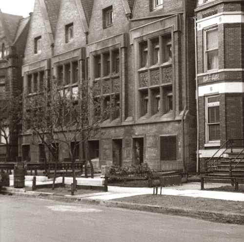 Little can be found about Gilman Lane. He photographed building in the Chicago area including many of Wright’s work. His photographs were given to the Oak Park Public Library after his death in 1961. These Lane images were photographed after the Manson images, but at the most a year or two. If you look at image #2 from both collections, you will notice that the tree trunk painted white in the Manson image #2 has faded in the Lane #2. Other similarities include the size of the trees, the flower pots sitting on the balustrades are in the same place, the 55 gallon drums are still there. A minor change is the one house number 3215 on unit two that is visible in this set. 1: Viewed from the Northwest. Approximately 45 years after completion. Units have basically remained unchanged on the outside. Balusters in front of unit three and four have been removed. Down spout between the third and fourth unit has been moved. The building on the right is still existing. Photographed in the spring or early summer.