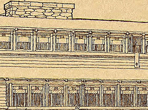 3a: This version appears to be a "duplex", two living rooms, joined fireplaces in the center, and porches on either end. Strong horizontal lines, low-pitched cantilevered roof, broad overhanging eaves, horizontal rows of mullion divided glass windows, centrally located stone fireplace and chimney, porches. Wright designed built-in planters like many of his buildings at that time. Although the Cottages were economically built, Wright details still exist. Partition walls like those he designed in Usonian homes. Mullion windows, stone fireplaces and designed ceiling details. They were built as summer Cottages so lacked central heating. 3b: Strong horizontal lines, low-pitched cantilevered roof, broad overhanging eaves, horizontal rows of mullion divided glass windows, centrally located stone fireplace and chimney, porches. 3c: Low-pitched cantilevered roof, broad overhanging eaves, horizontal rows of windows. Wright designed built-in planters like many of his buildings at that time. 3d: Detail of the exposed cross beam that exist in the remaining cottage. 3e: Detail of one of the optional designs proposed for the Como Orchard Summer Colony. 3f: Centrally joined fireplace in the center served two the living room on either side. Wright included a cloth hung on the window sill. 3g: Low-pitched cantilevered roof, broad overhanging eaves, built-in planters.