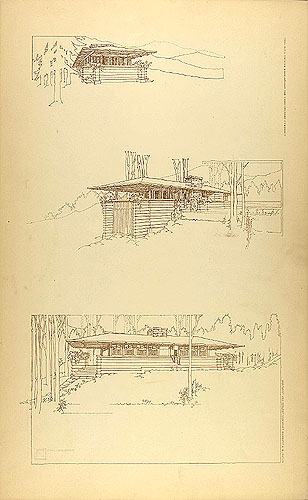 Plate XLVI(b). Plan of the Como Orchard Summer Colony 1: Plate XLVI(b). The Site Plan (tissue), placed the Clubhouse in the center. Fifty-nine cottages were proposed in clusters around the Clubhouse. The Clubhouse looked east toward the Bitterroot Valley. Wright designed a beautiful tree-lined three leveled (four in site plan) water feature with sidewalks on either side. It began with a large fountain. Each level (pool) had a waterfall that cascaded down toward the man-made pond. The final waterfall flowed over a semi-circle. The back of the clubhouse faced West toward the Bitterroot Mountains and looked out over the Garage and five Tennis Courts. 2: Detail of the site plan. Fifty-nine cottages were proposed in clusters around the Clubhouse. The Clubhouse looked east toward the Bitterroot Valley. Wright designed a beautiful tree-lined three leveled (four in site plan) water feature with sidewalks on either side. It began with a large fountain. Each level (pool) had a waterfall that cascaded down toward the man-made pond. The final waterfall flowed over a semi-circle. The back of the clubhouse faced West toward the Bitterroot Mountains and looked out over the Garage and five Tennis Courts. 3: The Clubhouse looked east out to a beautiful tree-lined three leveled (four in site plan) water feature with sidewalks on either side. It began with a large fountain. Behind the clubhouse was the Garage. 6: Of the fifty-nine cottages shown in this plate, the cottage on the top right is the only example of the last remaining cottage. Plate XLVII(a). Central Club House the Como Orchard Summer Colony 1: Plate XLVII(b). Viewed from the Southeast. The Clubhouse was conceived as the center of the community. It consisted of two communal Dining Rooms, one on either side, a two story lounge in the center for gathering, three fireplaces, guest bedrooms upstairs, a kitchen and servants rooms. An open second story balcony overlooked the lounge. Each end had a porte cochere (carriage entrance) with stairs that lead up to expansive partially covered porches. Dining Room doors were designed to open outward onto the porches. There were many classic Prairie styled Wright details in the Clubhouse. It was constructed of wood, utilizing horizontal board and batten siding. Strong horizontal lines, low-pitched roof, broad overhanging eaves, horizontal rows of mullion divided glass windows and glass doors, centrally located stone fireplaces and chimneys, balconies and porches. Wright designed built-in planters and added large vases like many of his buildings at that time, but they were eliminated when constructed to keep costs in line. 2: The Clubhouse was conceived as the center of the community. It consisted of two communal Dining Rooms, one on either side, a two story lounge in the center for gathering, three fireplaces, guest bedrooms upstairs, a kitchen and servants rooms. An open second story balcony overlooked the lounge. Each end had a porte cochere (carriage entrance) with stairs that lead up to expansive partially covered porches. Dining Room doors were designed to open outward onto the porches. There were many classic Prairie styled Wright details in the Clubhouse. It was constructed of wood, utilizing horizontal board and batten siding. Strong horizontal lines, low-pitched roof, broad overhanging eaves, horizontal rows of mullion divided glass windows and glass doors, centrally located stone fireplaces and chimneys, balconies and porches. Wright designed built-in planters and added large vases like many of his buildings at that time, but they were eliminated when constructed to keep costs in line. 3: Each end of the Clubhouse had a porte cochere (carriage entrance). Strong horizontal lines, low-pitched roof, broad overhanging eaves and built-in planters. 4: Built-in planter, balcony and guest bedrooms upstairs. Strong horizontal lines, low-pitched roof, broad overhanging eaves, horizontal rows of mullion divided glass windows and glass doors. Wright added a large signature vases like in many of his buildings at that time. It were eliminated when constructed. 5: The Clubhouse included three stone fireplaces, guest bedrooms upstairs, and horizontal rows of mullion divided glass windows that opened outward. Wright even included a cloth hung on the window sill. Dining Room doors were designed to open outward onto the porches. 6: Built-in planters, balconies and guest bedrooms were upstairs. An open second story balcony overlooked the lounge on the right. Strong horizontal lines, low-pitched roof, broad overhanging eaves large fireplaces, large vases, all classic Wright details. 7: Wright designed elaborate built-in planters and large vases like many of his buildings at that time, but they were eliminated when constructed. Stairs lead to expansive partially covered porches. Strong horizontal lines, low-pitched roof, broad overhanging eaves, horizontal rows of mullion divided glass windows and glass doors, balconies and porches. 8: The center of the Clubhouse included a two story lounge in the center for gathering, an open second story balcony overlooked the lounge and built-in planters on the outside. 9: Built-in planter, balcony and guest bedrooms upstairs. Strong horizontal lines, low-pitched roof, broad overhanging eaves, horizontal rows of mullion divided glass windows and glass doors. Wright added a large signature vases like in many of his buildings at that time. It were eliminated when constructed. 10: Each end of the Clubhouse had a porte cochere (carriage entrance). Strong horizontal lines, low-pitched roof, broad overhanging eaves and built-in planters.