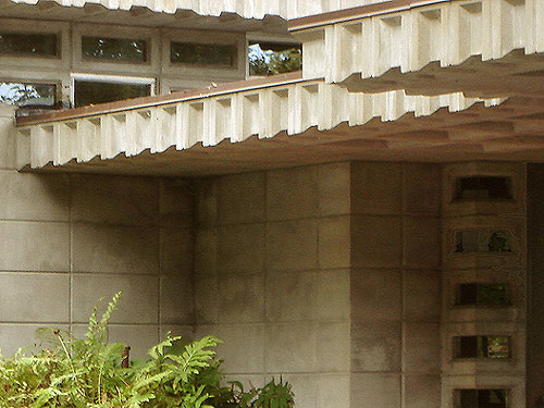 Wright used concrete blocks in many of his homes. But this was only the fourth Usonian Automatic home built using concrete molded blocks. (Adelman S.344, Pieper 349, Tonkens 386, Kalil 387, Turkel 388, Tracy 389 and Pappas 392). Others were designed using this method, but constructed of standard concrete blocks. If the Kalil home looks similar to the Tracy Residence (S.389), its because the same molds were used in both homes. Not only are the overhead blocks two foot square, but the home is built on a two foot square grid system, which is consistent with the other homes built of this style. The vertical wall blocks measure one foot by two feet.