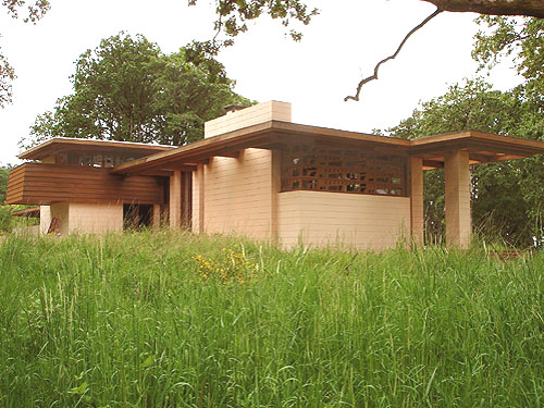 Cantilevered and trellised roof overhangs. Rows of vertical
