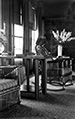 Lloyd Wright leaning over a desk, cigarette in his left hand, pencil in his