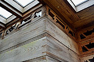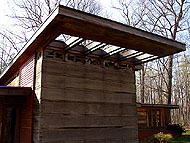 Description: As you approach the home from the same direction as in 1939, the Carport, it has been positioned on a slope much like the original. Like many of Wright's designs, the entrance is hidden, and is not revealed until you reach the home. The lack of windows on the approach reveals little of the interior of the home. Perforated Light Screens allow soft light into the home, adding a measure of privacy and a decorative design element to the home. The roof of the Carport cantilevers out 8' 6" at the front, is 19' wide, and cantilevers out from the house 15' 6" in the back. The roof was designed with three layers of 2x4's, each superimposed on top of the other. The Perforated Light Screens... Continue, additional images...