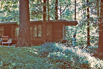 Description: Like many of Wright's Usonian homes, it was an "L" shaped design based on a 2x4 foot rectangular module. It was constructed of brick, natural unfinished cypress and glass. The home slowly rises above the ground as the ground slopes away from the home. Like many of Wright's designs, the entrance is hidden, and is not revealed until you reach the home. Four door panels make up the Entrance. The two outside panels are fixed, the two center doors are mounted... Continue, additional images...