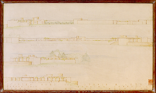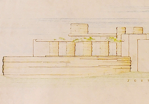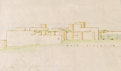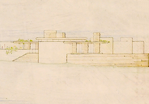 Description: Elevation of the Frank Lloyd Wright Desert Dwelling designed by Frank Lloyd Wright for himself in 1924. Photograph of original drawing in the Frank Lloyd Wright Archives. Text hand written: "Study for Desert Dwelling for FLLW. 1921 Los Angeles." Lower left: "2107.02." Published in
