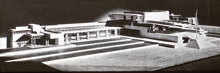 Description: A traveling exhibition of Wright's work, consisting of models, photographs and original drawings. A Preview of the exhibition was held in Philadelphia (January 1951). The world wide tour opened in Palazzo Strozzi Florence, Italy (June 1951). In "Sixty Years" (New York), Wright notes that from Florence the Exhibition traveled to "Switzerland, France, German and Holland". The Exhibition catalogs are dated: Paris (April 1952), Zurich (End of May 1952), Munich (May 16 - June 15, 1952), and Rotterdam (dated June 1, 1952). After two years in Europe the exhibition crossed the Atlantic to Mexico City, then to New York (1953). After an exhibition in Los Angeles, June, 1954, the final exhibition took place in Chicago, October, 1956. The Los Angeles exhibition premiere was held at Barnsdall Park's Municipal Art Center on June 1, 1954, then open to the public from June 2 to July 11, and was extended to July 25, 1954. A temporary pavilion, similar to the pavilion in New York, was attached to the line of kennels that reached from the house to the garage. E