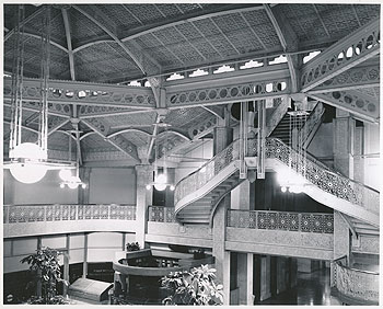 Description: View of the Balcony. Photographed in 1972 by Richard Nickel. The Rookery building was designed by Burnham and Root in 1888. Edward C. Waller, a client of Wright’s, managed the Rookery Building in 1905 and retained Wright in 1905 to remodel the Entryway and Lobby. Wright’s offices were located in the building from 1898-1899. Wright removed most of Root’s original iron ornamentation and simplified it with geometric designs. He also encased much of Root's elaborate wrought iron finishes with white carved and gilded Carrara marble. He simplified the ironwork design, added large prairie styled urns and designed hanging light fixtures. Courtesy of The Art Institute of Chicago, Ryerson & Burnham Archives.
