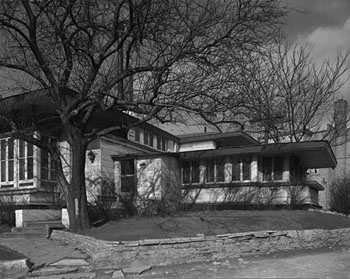 1) Viewed from the Northwest, across the street on Rogers Avenue. The covered Porch is on the left, Living Room in the center and Dining Room on the far right. The front sidewalk that started at Rogers Avenue and passed in front of the Living Room to the Entrance, has been removed and the front yard has been paved. The exterior walls have been covered with asbestos shingles. Storm windows cover the Porch and Living Room windows. An apartment building on Eastlake Terrace can be seen in the background on the far right. Photographed by John Gordon Replinger. Courtesy of the Art Institute of Chicago. (S#0831.26.0512) 2) The exterior walls have been covered with asbestos shingles. Storm windows cover the Porch windows. 3) The exterior walls have been covered with asbestos shingles. Storm windows cover the Living Room windows. An apartment building on Eastlake Terrace can be seen in the background on the right. 4) The Entrance is to he right of the Living Room Bay. The Dining Room can be seen in the center. An apartment building on Eastlake Terrace can be seen in the background on the far right. Hedrich Blessing, January 1, 1963