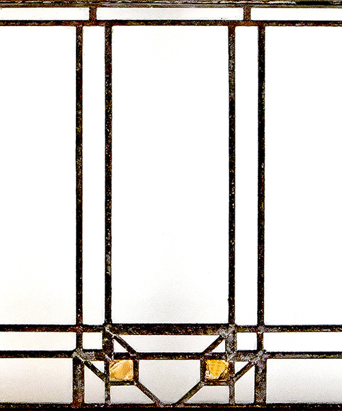 Executed in clear and gold-foiled glass. Copper-plated zinc cames are in two widths. 1/4" and 3/8" wide. Window frames: 40" wide x 22" high. Leaded glass window: 35" wide x 16" high. (S#0086.36.1025)2) Detail of the Oscar Steffens Residence, Chicago, Illinois, Clerestory Window 1909 (FLLW #0909) (1909 - S.153). Original Living Room clerestory window from the Oscar Steffens Residence. One of three clearstory windows in the living room. Executed in clear and gold-foiled glass. Copper-plated zinc cames are in two widths. 1/4" and 3/8" wide. Window frames: 40" wide x 22" high. Leaded glass window: 35" wide x 16" high. (S#0086.36.1025) 3) Detail of the Oscar Steffens Residence, Chicago, Illinois, Clerestory Window 1909 (FLLW #0909) (1909 - S.153). Original Living Room clerestory window from the Oscar Steffens Residence. One of three clearstory windows in the living room. Executed in clear and gold-foiled glass. Copper-plated zinc cames are in two widths. 1/4" and 3/8" wide. Window frames: 40" wide x 22" high. Leaded glass window: 35" wide x 16" high. (S#0086.36.1025) 4) Detail of the Oscar Steffens Residence, Chicago, Illinois, Clerestory Window 1909 (FLLW #0909) (1909 - S.153). Original Living Room clerestory window from the Oscar Steffens Residence. One of three clearstory windows in the living room. Executed in clear and gold-foiled glass. Copper-plated zinc cames are in two widths. 1/4" and 3/8" wide. Window frames: 40" wide x 22" high. Leaded glass window: 35" wide x 16" high. (S#0086.36.1025) 5) Detail of the Oscar Steffens Residence, Chicago, Illinois, Clerestory Window 1909 (FLLW #0909) (1909 - S.153). Original Living Room clerestory window from the Oscar Steffens Residence. One of three clearstory windows in the living room. Executed in clear and gold-foiled glass. Copper-plated zinc cames are in two widths. 1/4" and 3/8" wide. Window frames: 40" wide x 22" high. Leaded glass window: 35" wide x 16" high. (S#0086.36.1025) WEST ELEVATION / WINDOWS 1909 1) Oscar Steffens Residence, Chicago, Illinois, West Elevation / Windows, 1909 (1909 - S.153).