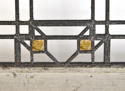 Executed in clear and gold-foiled glass. Copper-plated zinc cames are in two widths. 1/4" and 3/8" wide. Composed of 30 pieces of glass. Window frames: 40" wide x 22" high. Leaded glass window: 35" wide x 16" high. Acquired from a private collection through Toomey & Company. (S#0086.36.1025)