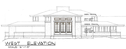 1) Sheet 1, Site Plan 1963. The lot was located on the Southeast corner of Sheridan Road and Rogers Avenue. Set back against the alley, this offered a larger front and side yard. Being built on the top of a "ridge", the highest point on the lot, also offered expansive views of Lake Michigan from the upper Bedroom windows until apartments blocked the view. The Lake was only half a block away. Courtesy of the National Park Service. (S#1565.93.1225) 1A) Site Plan superimposed over an areal view of the lot in 2012. The lot was located on the Southeast corner of Sheridan Road and Rogers Avenue. Set back against the alley, this offered a larger front and side yard. A large apartment complex now occupies the space of the original single family Steffens Residents. Rogers Avenue was widened to accommodate parking on the street. Image courtesy of the Google Maps. (S#1565.94.1225) FLOOR PLAN Floor plan for the First level. The Living Room windows were originally designed to run from floor to ceiling, but alterations created a bay, with the top lining up with the base of the upper clerestory windows. Spindled screens on either side of the Living Room added a measure of privacy. The exterior balcony lowered the ceiling on either side, creating a space with a space. With built-in seating, this feature is reminiscent of the Usonian Living Rooms Wright designed decades later. From the corner of Sheridan and Rogers, the entrance to the home was hidden. Upon entering the home when you turned left (North) and walked past the Living Room and centralized Fireplace, a double set of doors lead out to an enclosed covered porch, with a built-in Planter. The stairs across from the Entrance lead to the second floor. To the right (South) was the Dining Room. A spindled screens enclosed the stairway, adding a sense of privacy. As you pass through the Dining Room, you enter the Kitchen. Passing through the Kitchen allowed access to the utility rooms and the enclosed rear Porch. Stairs lead down to the Rear Porch, and additional stairs to the Utility rooms which were located behind the Fireplace. By lowering these rooms on the first floor, this allowed the roofline of the bedrooms upstairs to line up with the Living Room roof which was only a story and a half. Courtesy of "Frank Lloyd Wright, Ausgeführte Bauten (Executed Buildings)", 1911. Modified by Douglas M. Steiner, copyright 2012. Floor plan for the Second level. As you reach the top of the stairs, turn left and you enter the Balcony which overlooks the Living Room. On either side of the balcony, doors lead out to an exterior Balcony with built-in Planters. Bedrooms and the Bath were reached by turning right at the top of the stairs. A row of art glass clerestory windows were recessed just beneath the roof line. Courtesy of "Frank Lloyd Wright, Ausgeführte Bauten (Executed Buildings)", 1911. Modified by Douglas M. Steiner, copyright 2012. ELEVATIONS (SHEET 4)