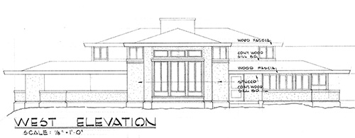 Detail of Sheet 4, West Elevation 1963. Lower Level: The covered Porch is on the far left, the Living Room in the center, the entrance just to the right, and the Dining Room is on the far right. Upper Level: The Master Bedroom is on the far left, the upper portion of the Living Room is in the center, with an exterior balcony on either side. A set of doors on either side lead from the interior Balcony to the exterior Balcony. The Bedrooms are on the far right. The Living Room windows were originally designed to run from floor to ceiling (see below), but alterations created a bay, with the top lining up with the base of the upper clerestory windows. Other alterations included reducing the number of windows on the upper level and narrowing the fireplace chimney.